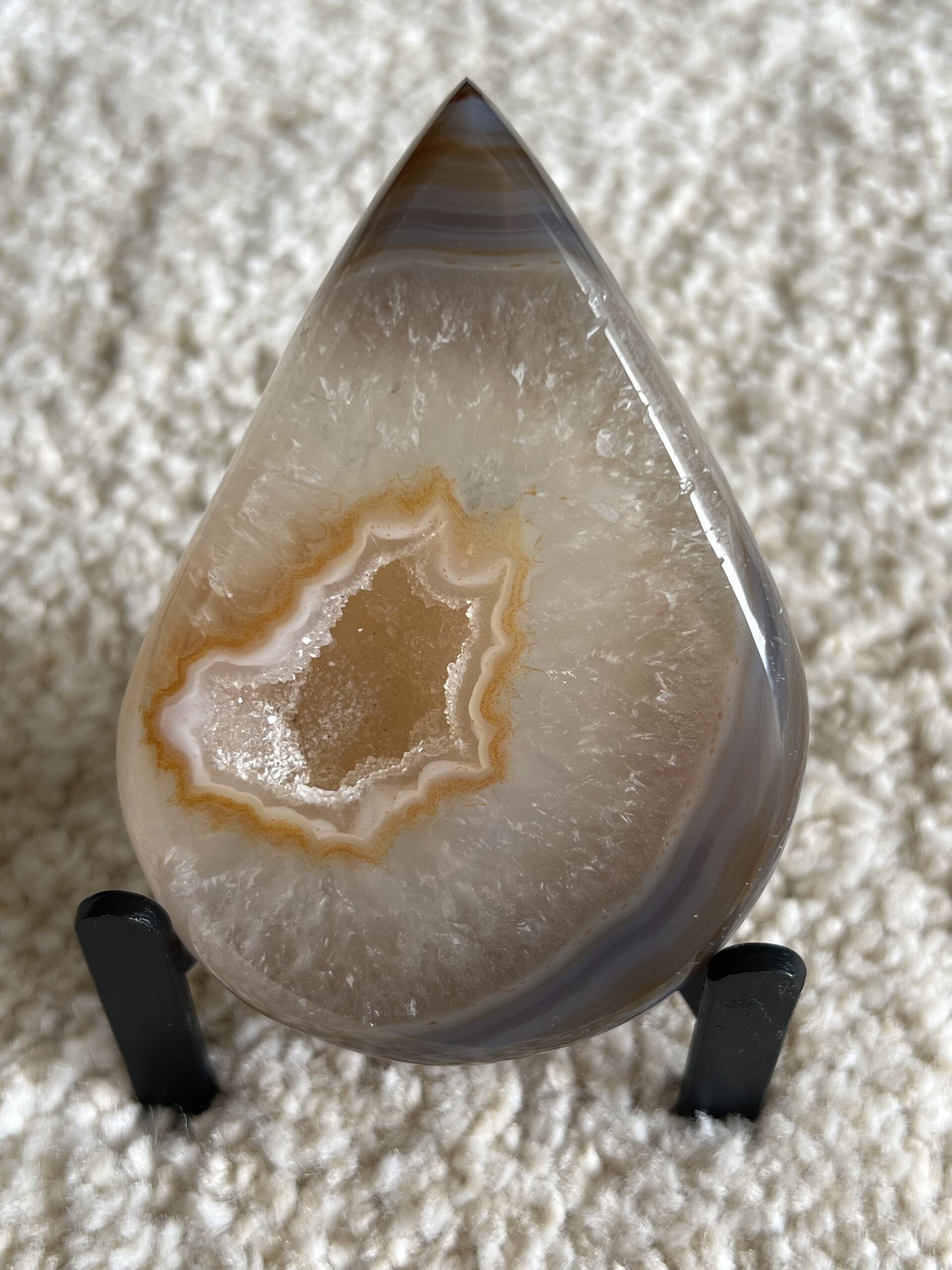 This piece is a stunning A-grade Agate, shaped by hand. She is 10 cm tall and weighs 220 grams. Stand included.