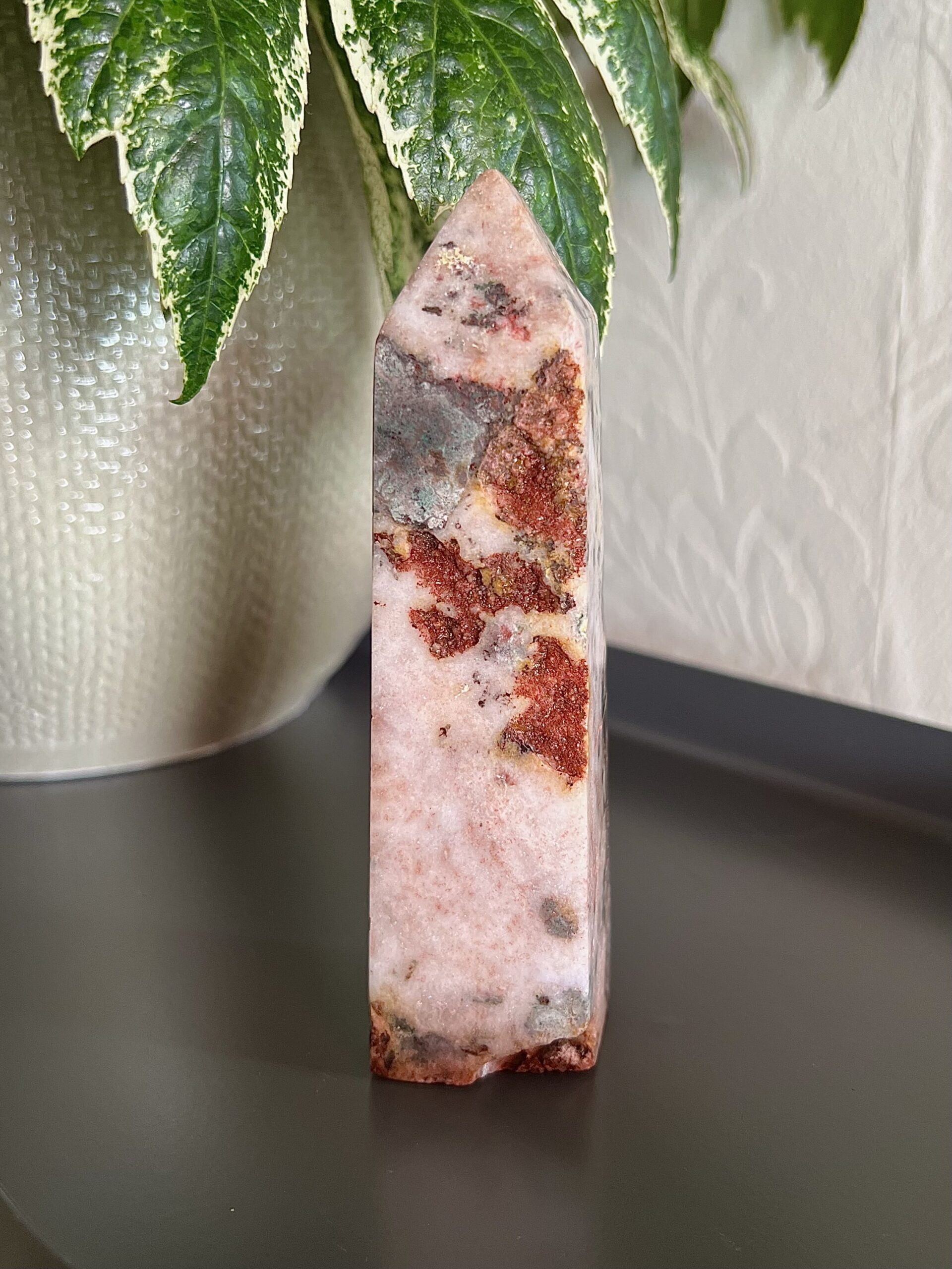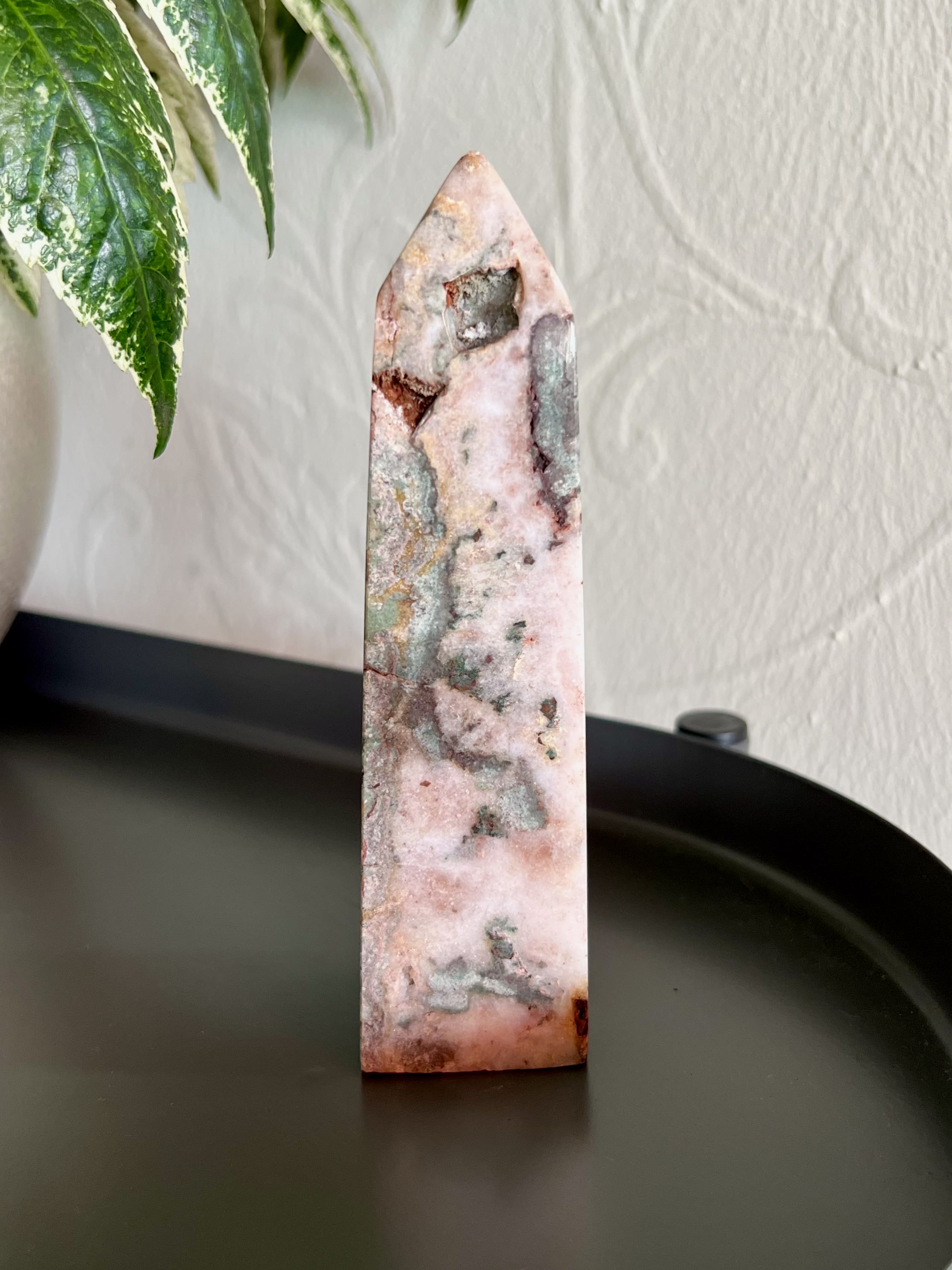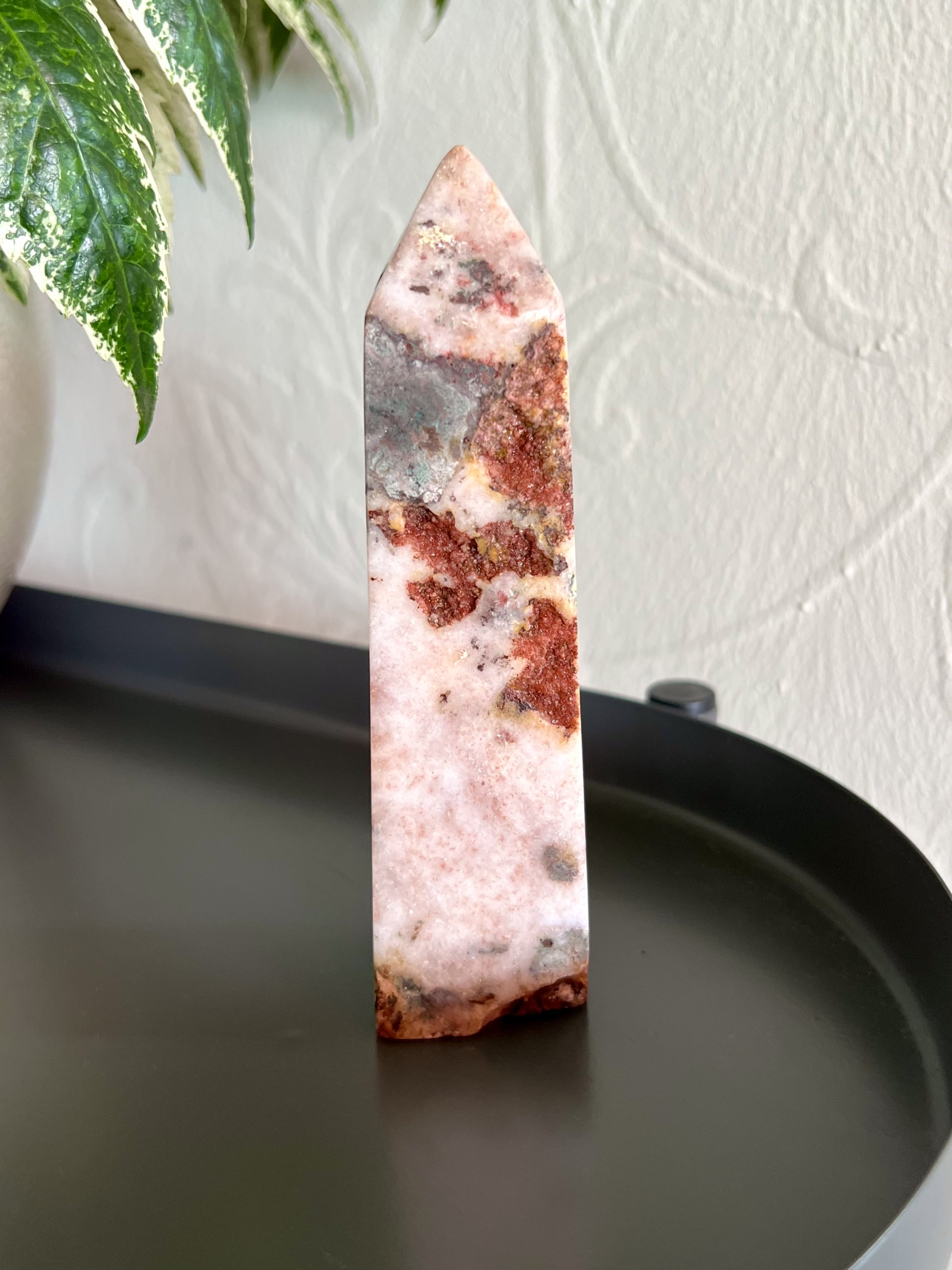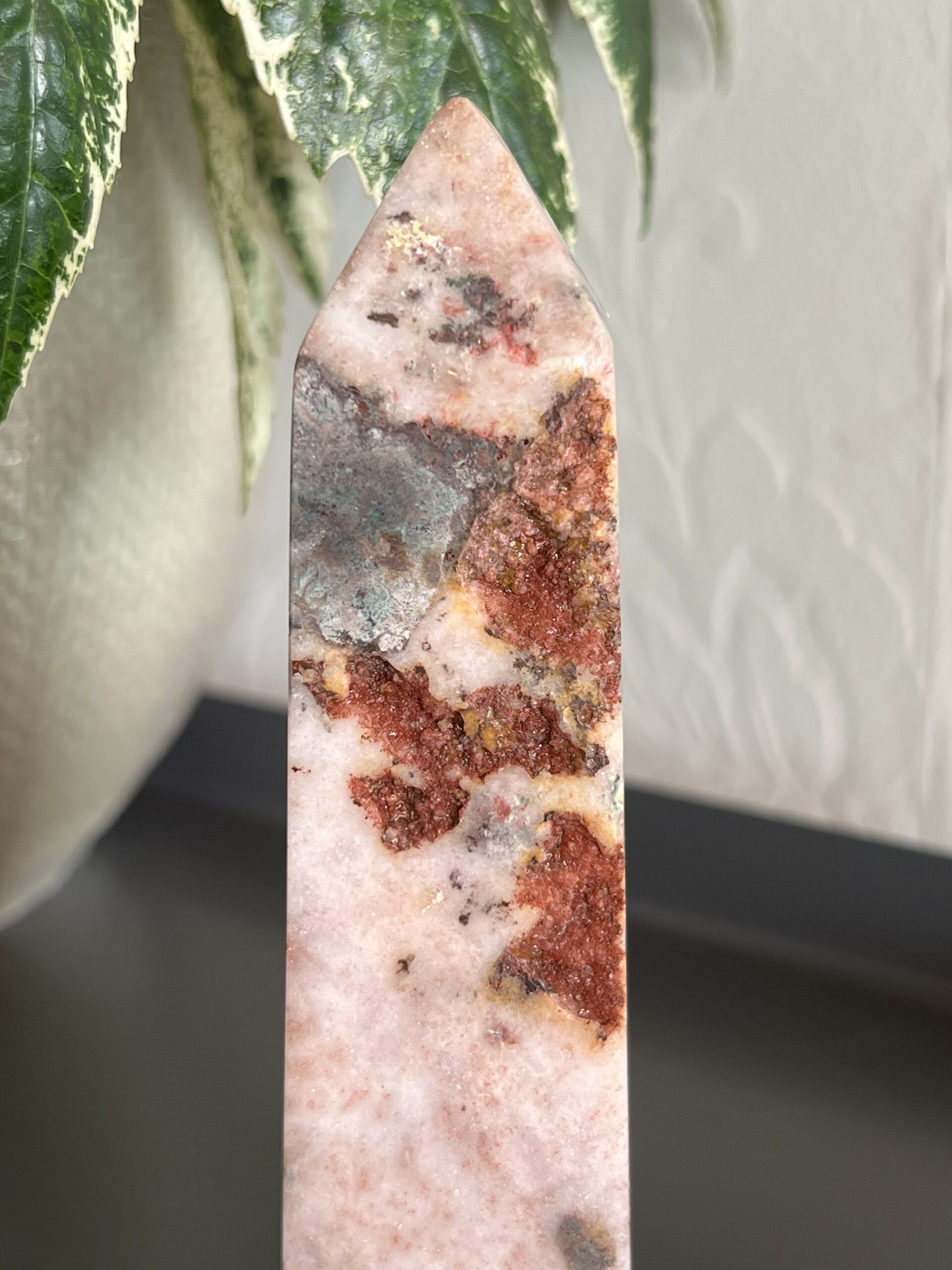 This is a beautiful, larger tower featuring Pink Amethyst, mossy Green Jasper and gorgeous red hematite deposits.