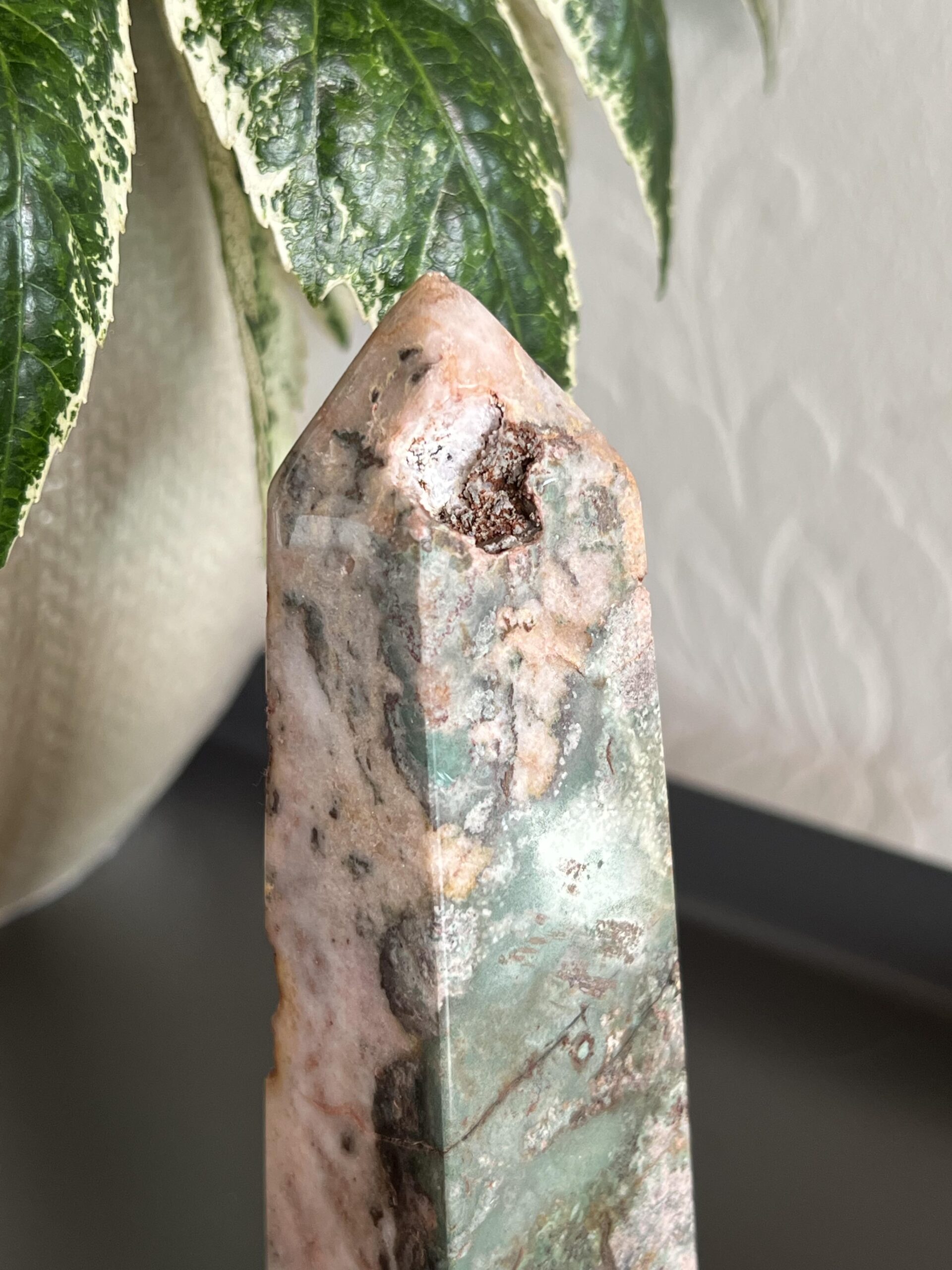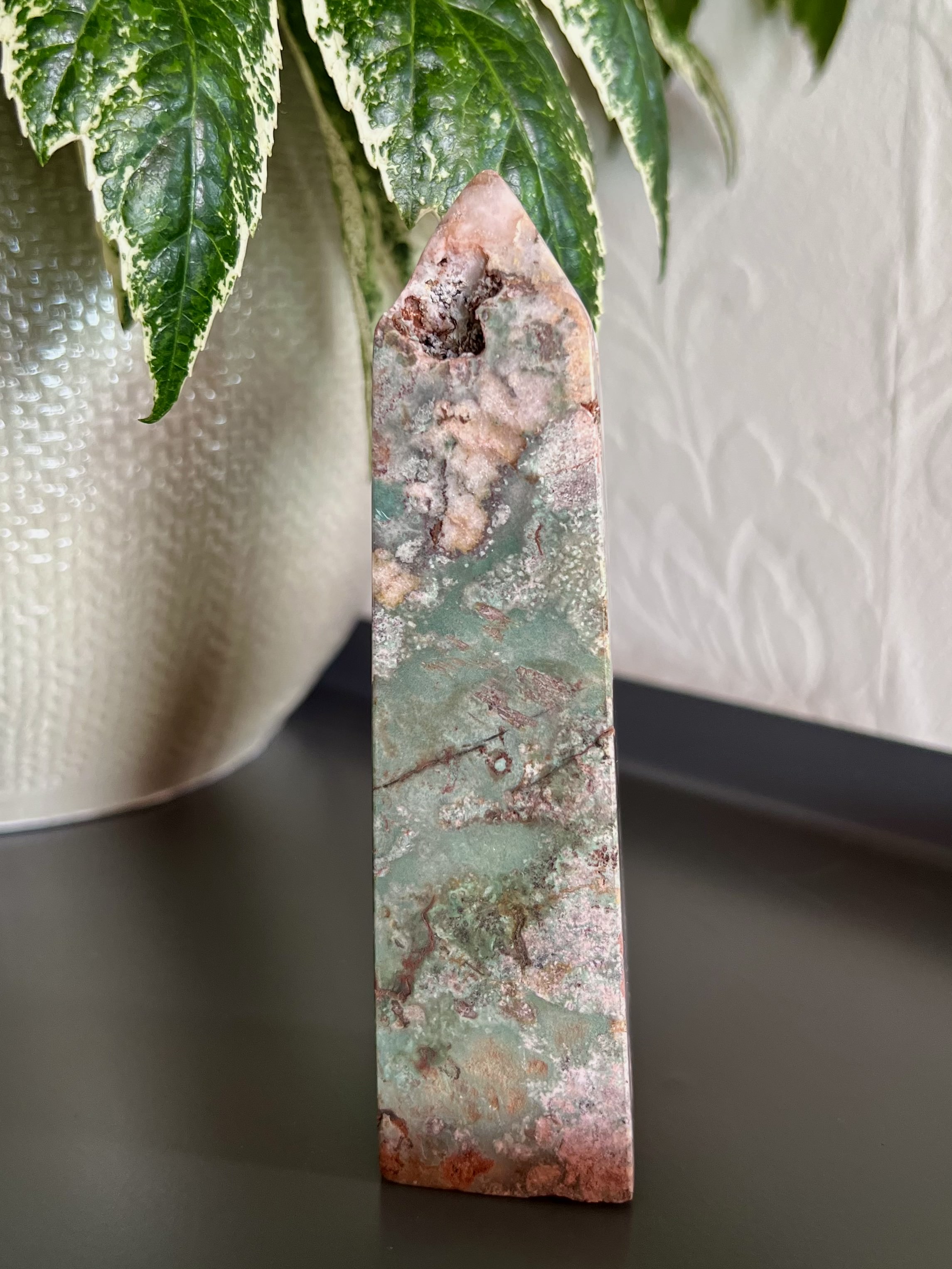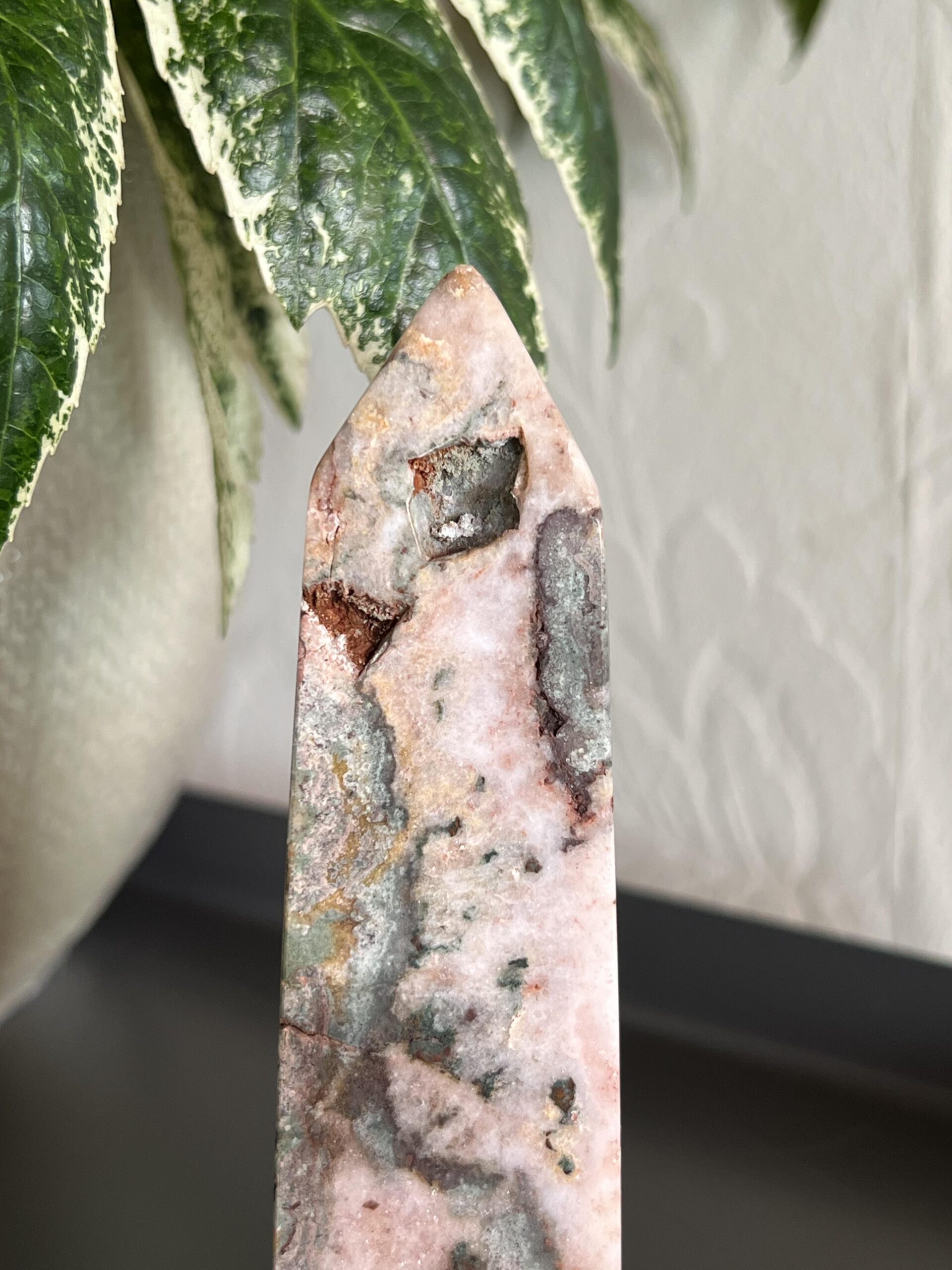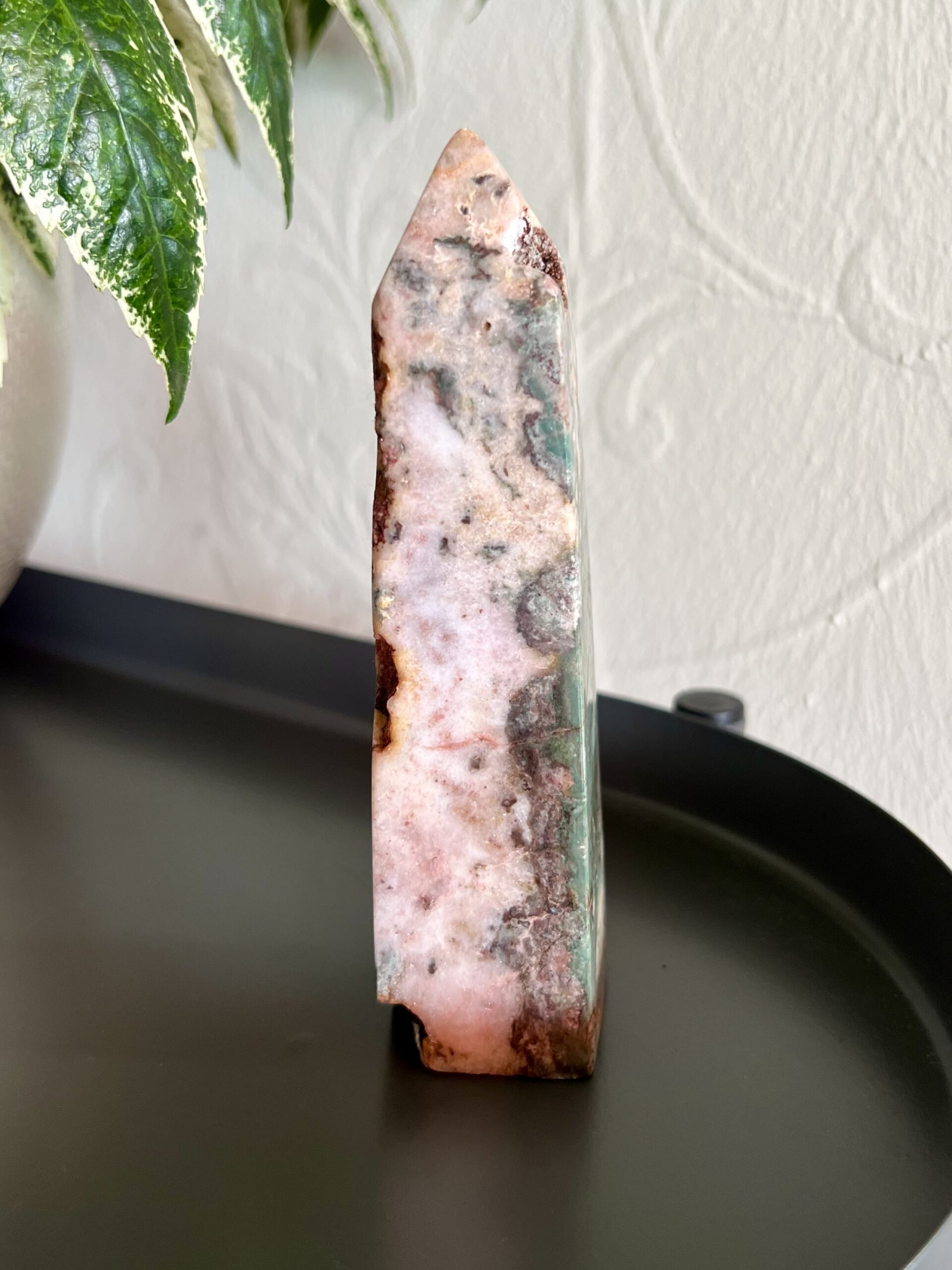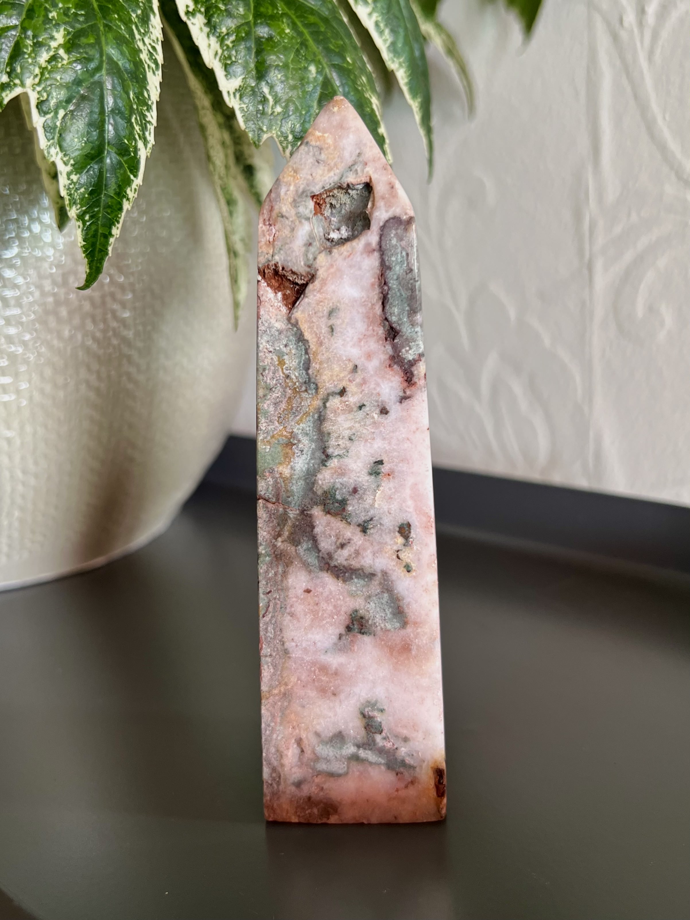 This is a beautiful, larger tower featuring Pink Amethyst, mossy Green Jasper and gorgeous red hematite deposits.
