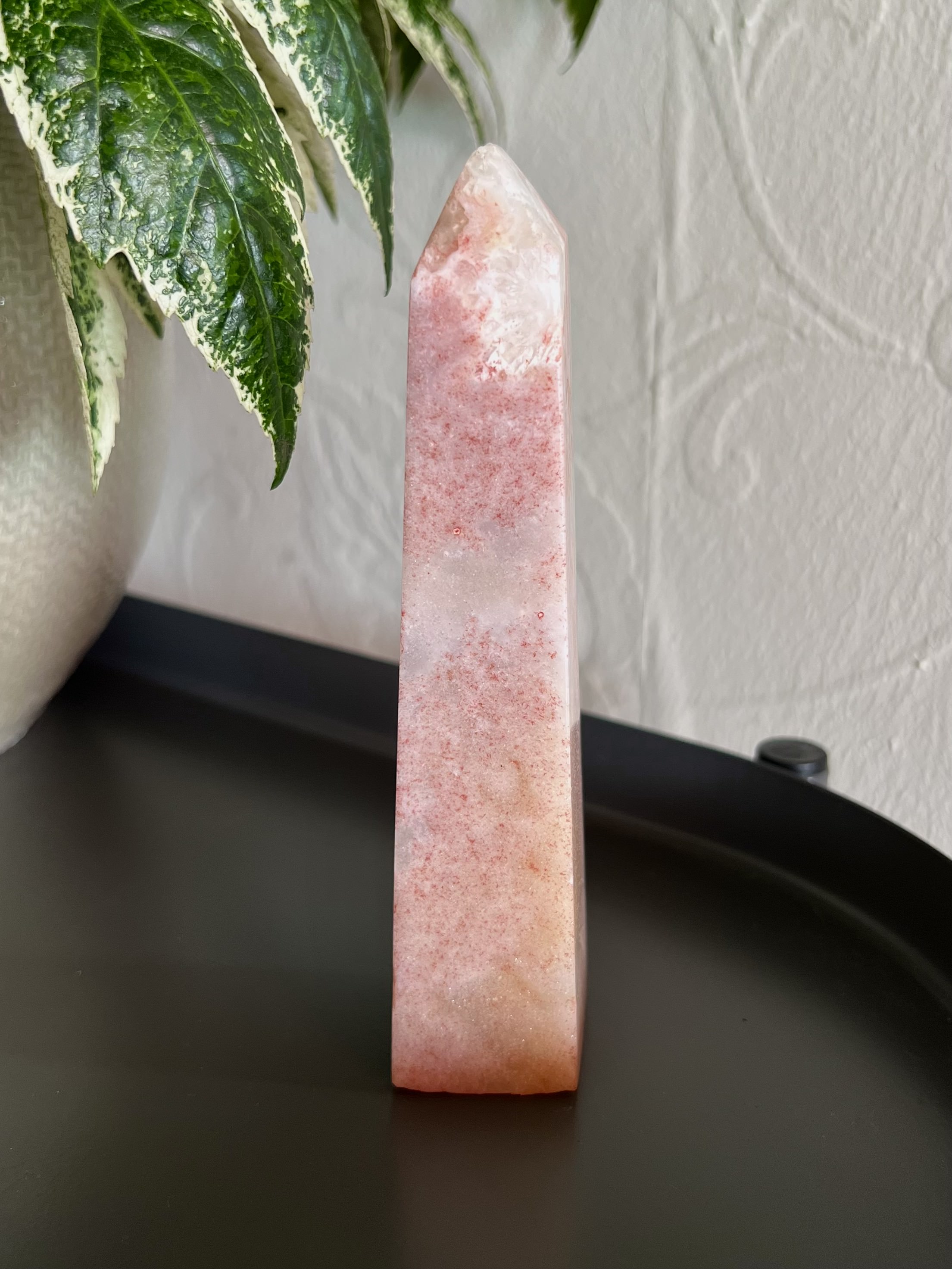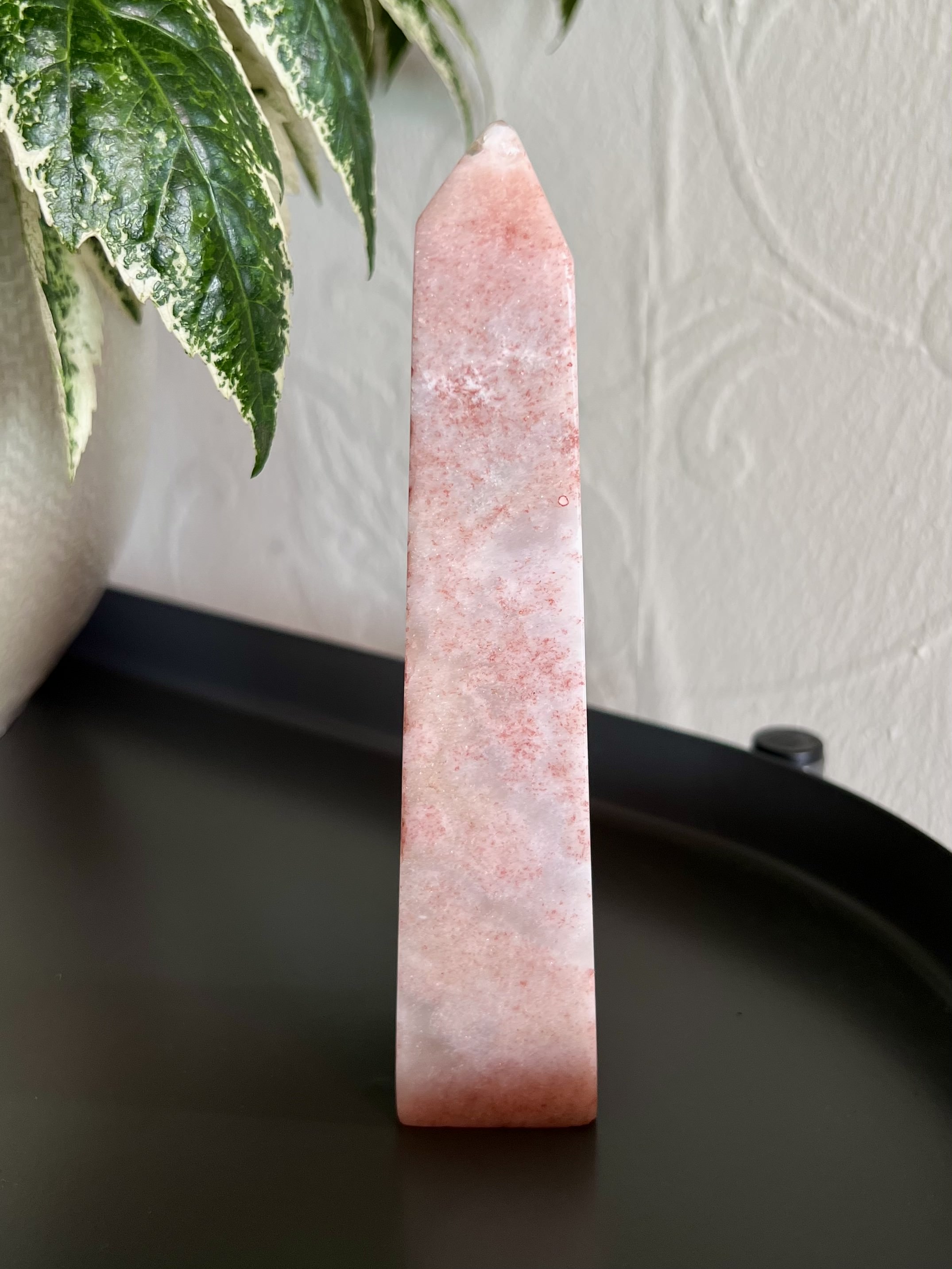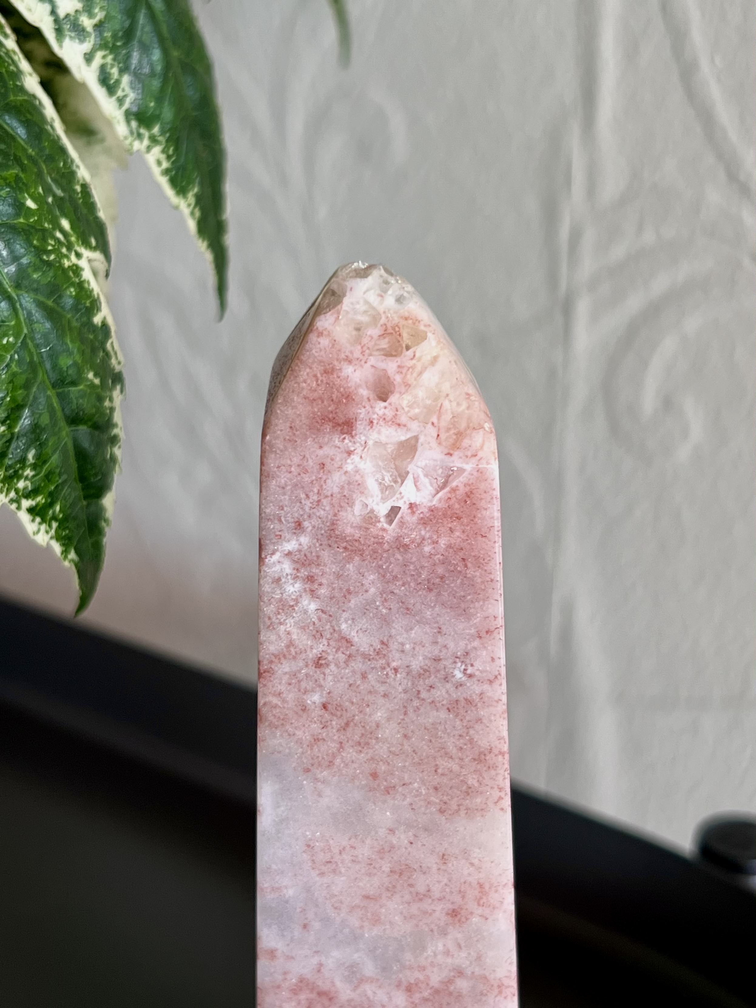 This chunky tower has a beautiful sparkle throughout. She features splotches of Hematite, which makes the Pink Amethyst appear almost red and gives this tower a strawberry vibe.