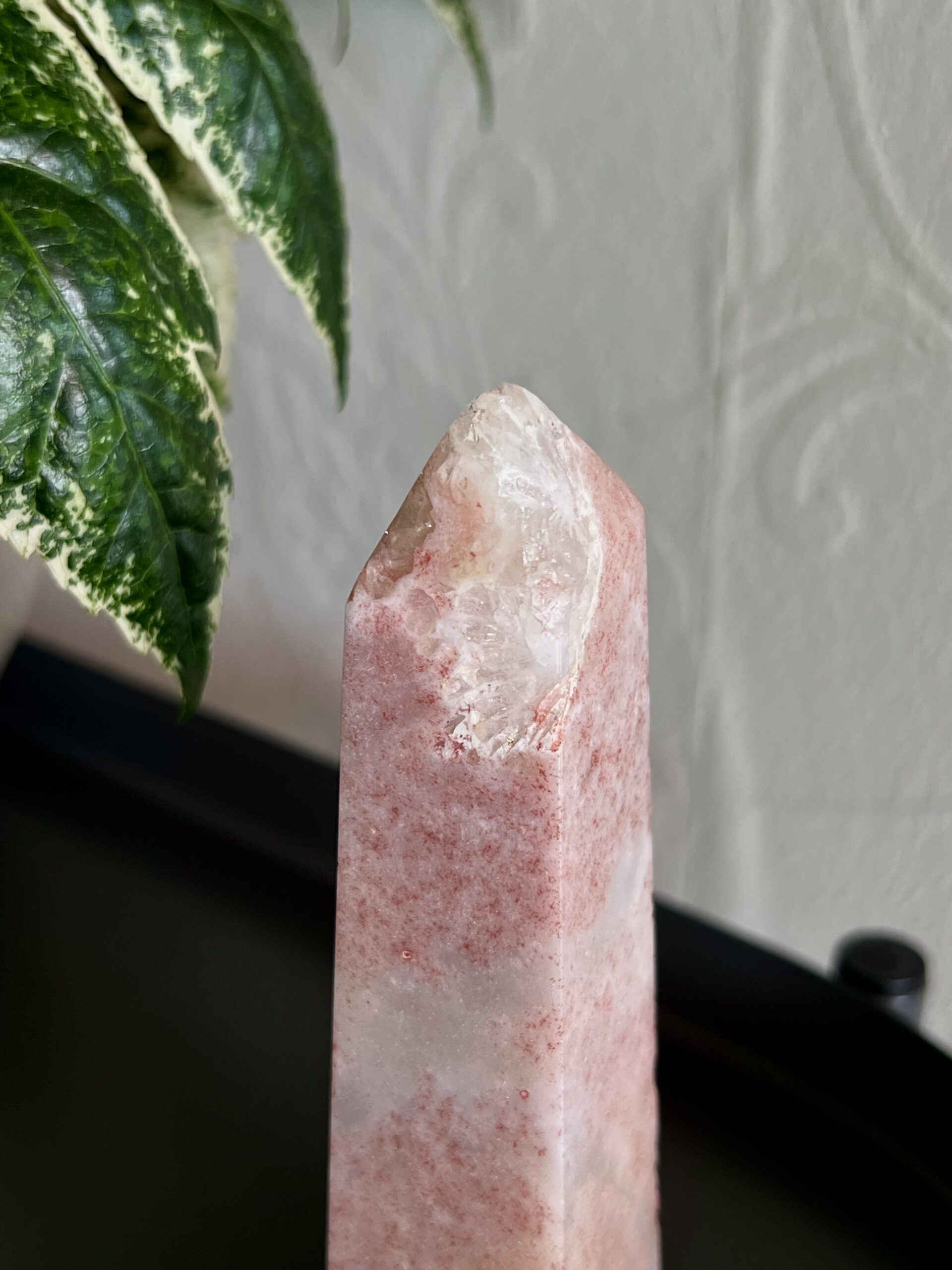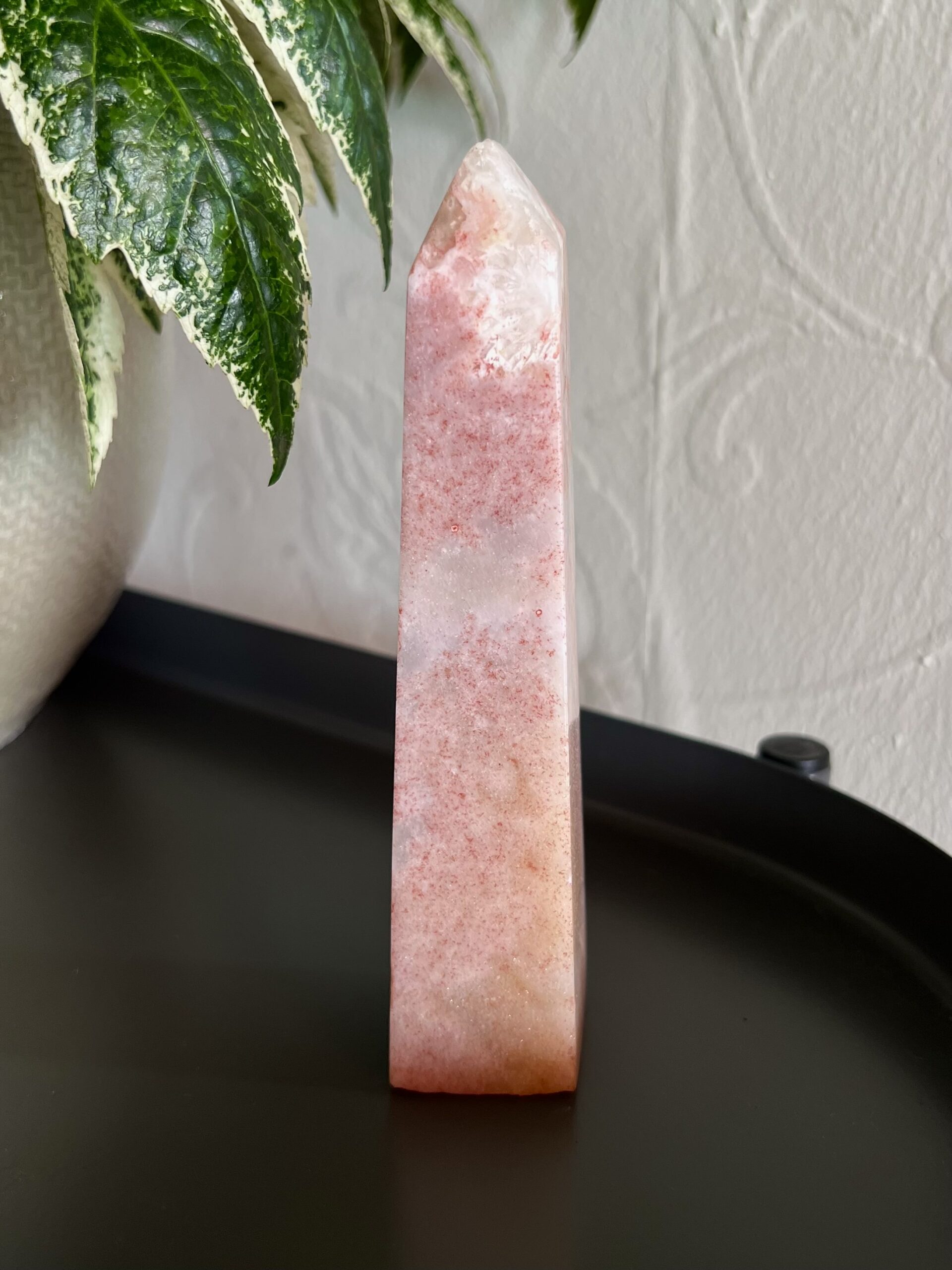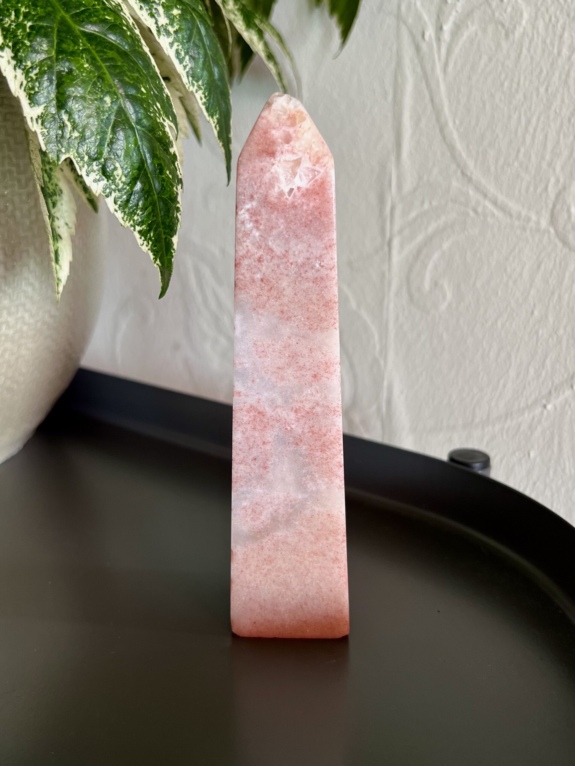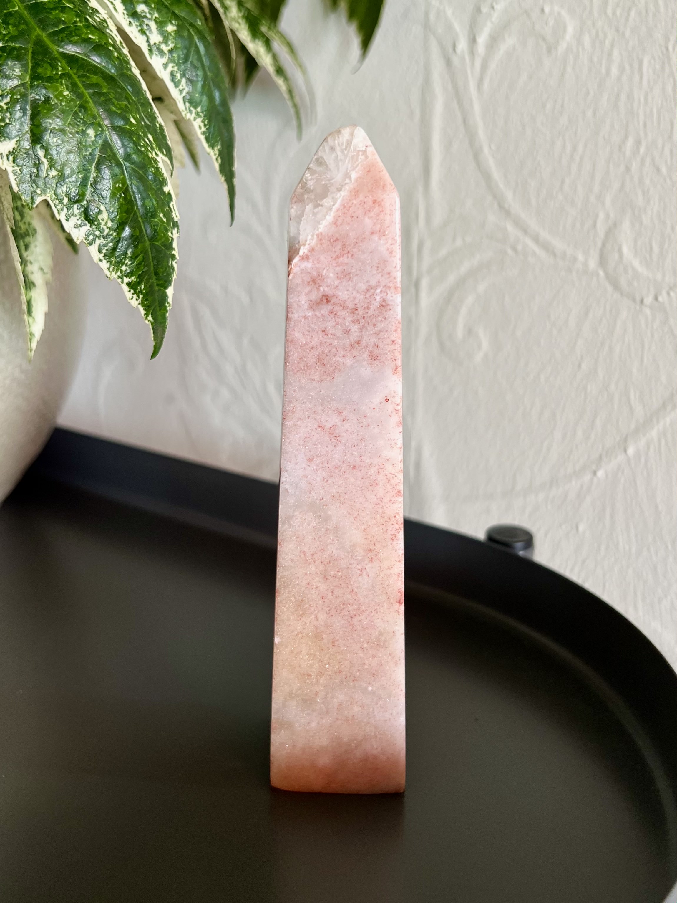 This chunky tower has a beautiful sparkle throughout. She features splotches of Hematite, which makes the Pink Amethyst appear almost red and gives this tower a strawberry vibe.